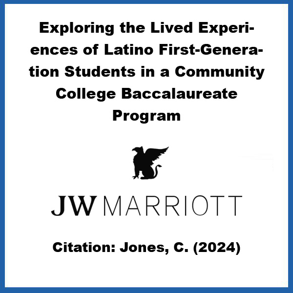 Citation: Jones, C. (2024)Exploring the lived experiences of Latino first-generation students in a community college baccalaureate program. In J. McClinton, A.E. Hernandez & A.L. Thornton (Eds.), Qualitative research with diverse and underserved communities. (pp.139-148).